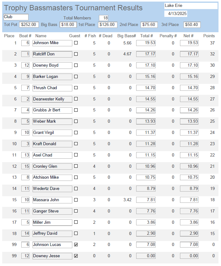 The Trophy Bassmasters kicked off the 2025 fishing season at Lake Erie last weekend. The crazy weather this spring took a day off and greeted the anglers with calm seas and clear skies. The catch rates reflected the good weather day as the 18 anglers brought in 78 keeper bass of at least 14”. Total weight was 213.33lbs. All were released alive. Big winner for the day was Mike Johnson as he both won the tournament and had the big bass for the day. Johnson’s 5 bass limit of smallmouth weighed 19.53lbs. with the lunker at 5.66lbs. Don Ratcliff weighed in a 5 bass limit of largemouth for 2nd place. Ratcliff’s creel totaled 17.17lbs. A very close 3rd place was Boyd Downey. Downey had 5 bass that weighed 17.10lbs to claim the final spot on the podium. The club has a new website with all the information about this tournament as well as archived info about the club going back to the year 2000. Log onto www.trophybassmasters.com for all the info.